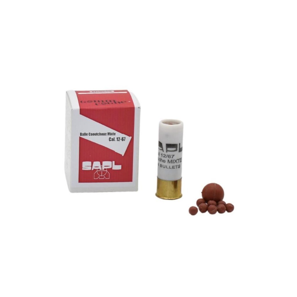 Cette munition de chez SAPL reprend le fonctionnement classique des munitions de défense à balle caoutchouc à la différence qu'elle possède plusieurs projectiles. En effet, la cartouches contiendra une balle caoutchouc de 18mm de diamètre ainsi que 8 petites balles de 7,3mm de diamètre. Ce système vous permettra d'avoir un gros impact avec la plus grosse bille et plusieurs billes à la manière de chevrotines pour augmenter la portée de votre tir.