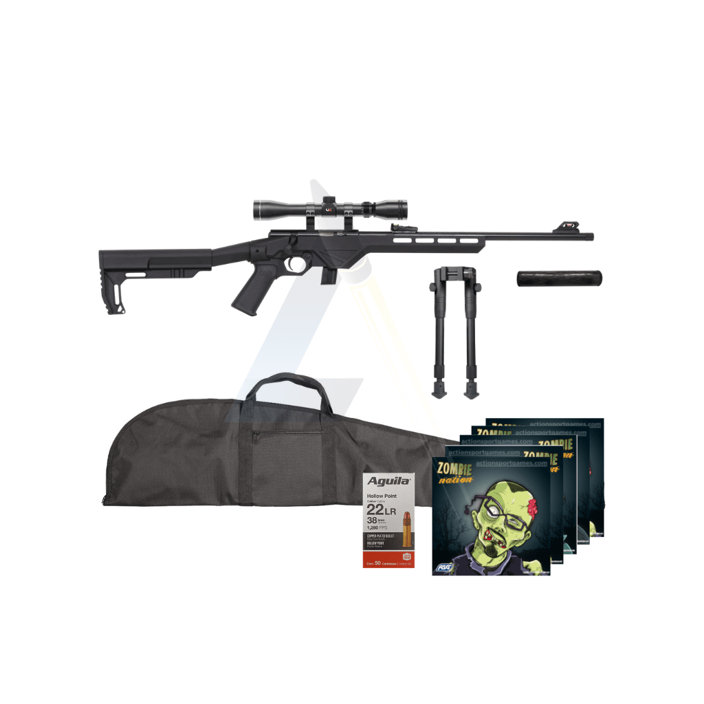 Enfin, un fourreau Umarex noir vous permettra le rangement et le transport de votre carabine. Une boîte de munitions Aguila (modèle selon arrivages) ainsi que 10 cibles Zombie vous seront fournis pour venir compléter ce pack.