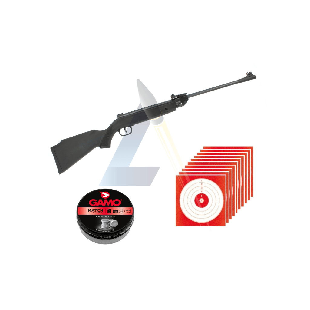 Cette Snowpeak B1-4P vous sera livrée en pack prêt à tirer avec une boîte de 250 plombs Gamo ainsi que 10 cibles en carton de 14x14 cm.