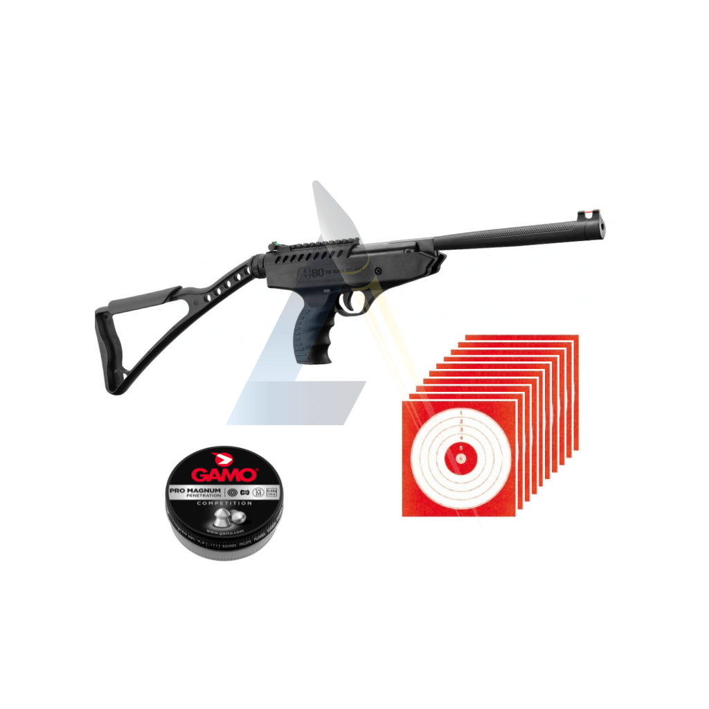 Vendu en pack prêt à tirer avec une boîte de 250 plombs Gamo Pro Mag et 10 cibles carton.