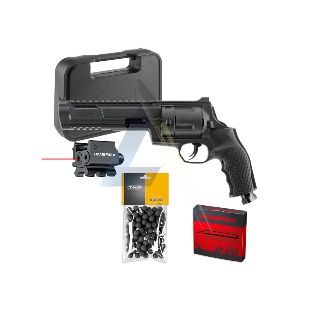Nouvelle version du revolver de défense de la gamme T4E en pack prêt à tirer avec laser et mallette de rangement.