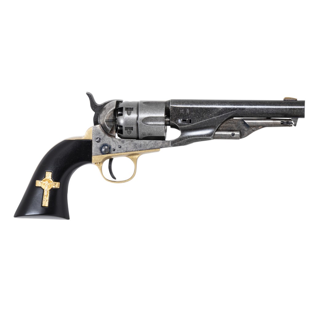 Destinées aux collectionneurs, aux fans de western ou de belles armes ainsi qu'aux tireurs, ces armes sont emblématiques des heures de gloire du Far-West. Découvrez ici un revolver avec une carcasse en acier vieilli et quelques touches de laiton : le guidon, le pontet et la poignée seront en laiton ce qui ajoute une touche de couleur bien visible et délimite les parties de l'arme. Les plaquettes de crosse de ce revolver seront en bois de noyer noir. La plaquette droite est surmontée d'un insert doré en forme de crucifix.